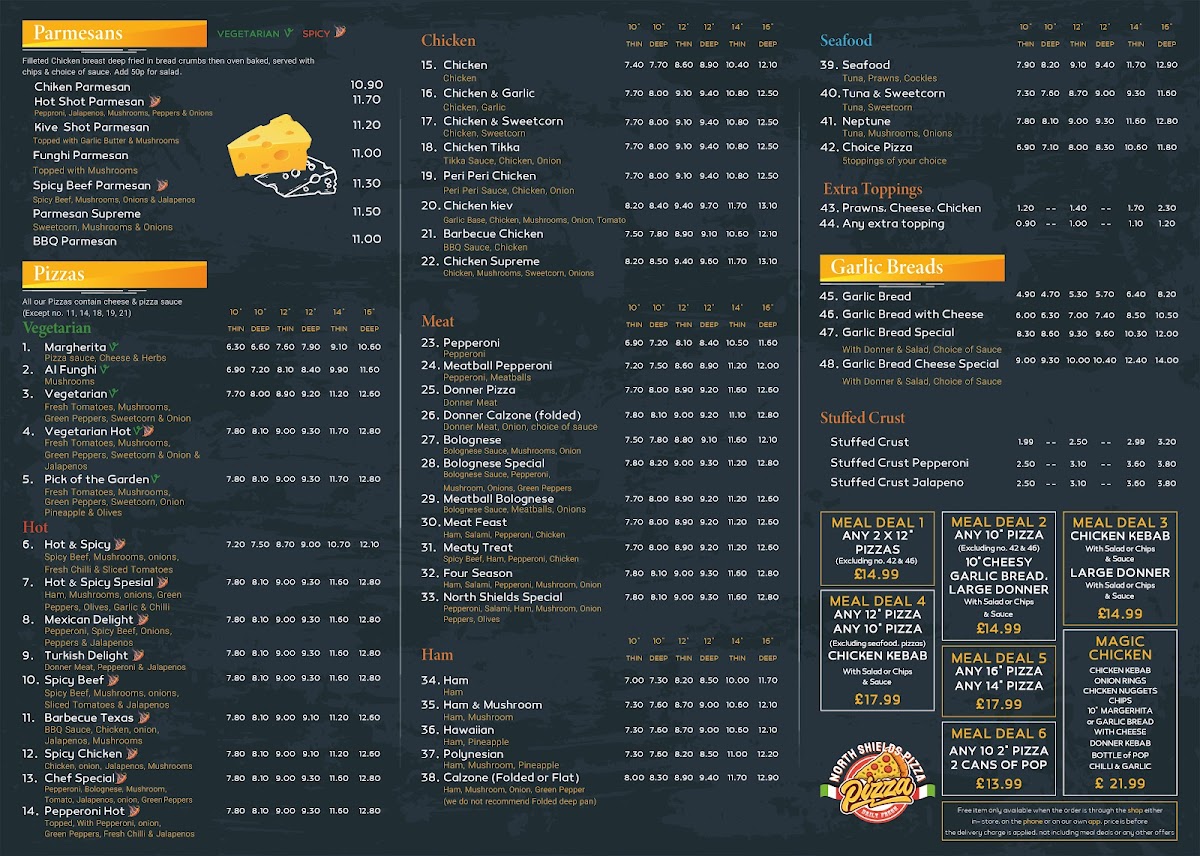 North Shields Pizza offers a wide variety of dishes to satisfy any craving, ranging from comforting snacks to hearty meals. Their Chips selection includes options like Cheesy Chips (£3.00), Cheesy Chips Bolognese (£3.50), and the Chip Butty (£2.50), perfect for a quick snack or a side. The menu also features generous extras like a Portion of Salad (£1.00), Coleslaw (£1.00), and a range of sauces including Tikka Sauce and Tandoori Sauce (each £1.00). For kids, there are choices such as Chicken Nuggets (£3.00) and a Kebab Butty (£3.50). Their Burgers include classics like the Cheese Burger (£4.00) and the flavorful Chilli Burger (£4.50). If you're in the mood for something more substantial, their Kebabs range from the traditional Donner Kebab (£5.00) to the House Special Chicken Kebab (£6.00). For something lighter, there are Wraps such as the Donner Wrap (£4.50) and the Mixed Wrap (£5.00). Pizza lovers can indulge in an array of options, from the Margherita (£5.00) to the bold Mexican Delight (£7.50), with meat lovers also catered for by pizzas like the Pepperoni (£6.00) and the Donner Pizza (£7.00). They also have tasty Parmesans like the Chicken Parmesan (£6.00) and Spicy Beef Parmesan (£6.50). Don’t miss the garlic bread, with choices like the Garlic Bread with Cheese (£3.50) or the Garlic Bread Special (£4.00). With such a broad range of affordable dishes, North Shields Pizza is a great spot for both casual dining and satisfying cravings.
